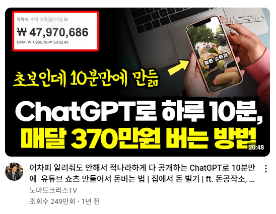 노마드크리스는 많은 사람들이 돈 버는 방법을 찾아 헤매지만, 결국은 '실행하지 않기 때문에' 아무 일도 일어나지 않는다고 지적합니다. 그는 AI 유튜브 쇼츠가 현재 가장 효과적인 부업인 이유를 다음과 같이 설명합니다.