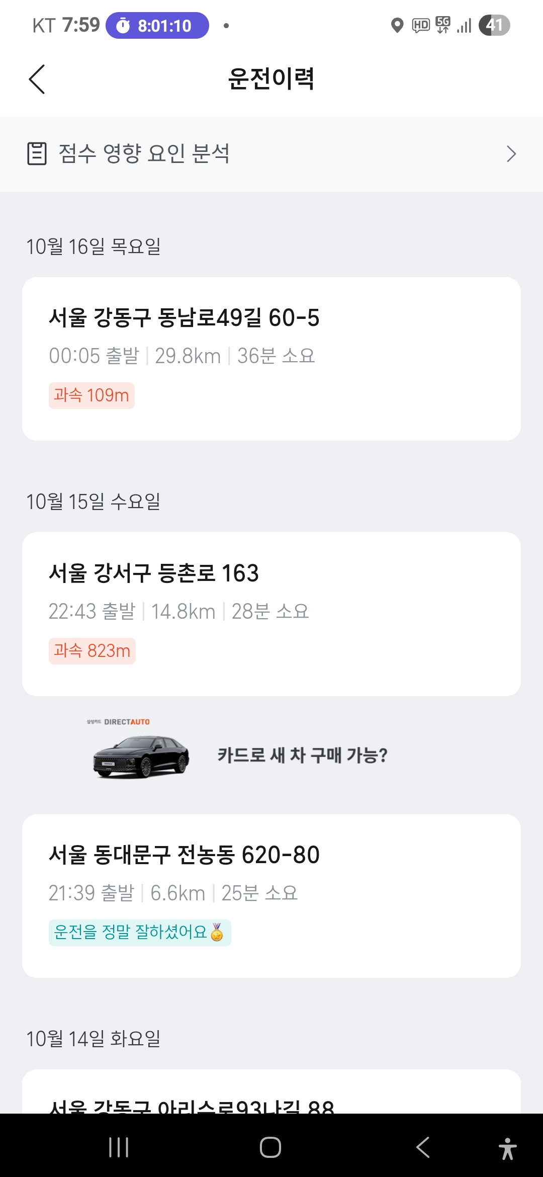 다시 종로로 돌아와 등촌동이라는 낯선곳에 차만 가져다 놓는데 무려 28천원을 준다는 콜을 잡아 현대차의 제네시스를 시승했다. 빗길 주행에도 불편함이 없는 명차다.