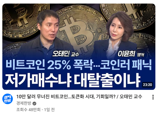 한양대 오태민 교수는 '경제한방'에 출연하여, 비트코인 10만 달러 지지선 붕괴가 단순한 가격 하락이 아닌, **'반감기 패턴의 종말'**과 '토큰화 시대'라는 새로운 금융 질서의 시작을 알리는 신호라고 분석했습니다. 그는 지금의 혼란 속에서 투자자들이 주목해야 할 것은 가격이 아니라, 이더리움과 빅테크 기업들이 주도하는 금융 시스템의 대변혁이라고 역설했습니다.
